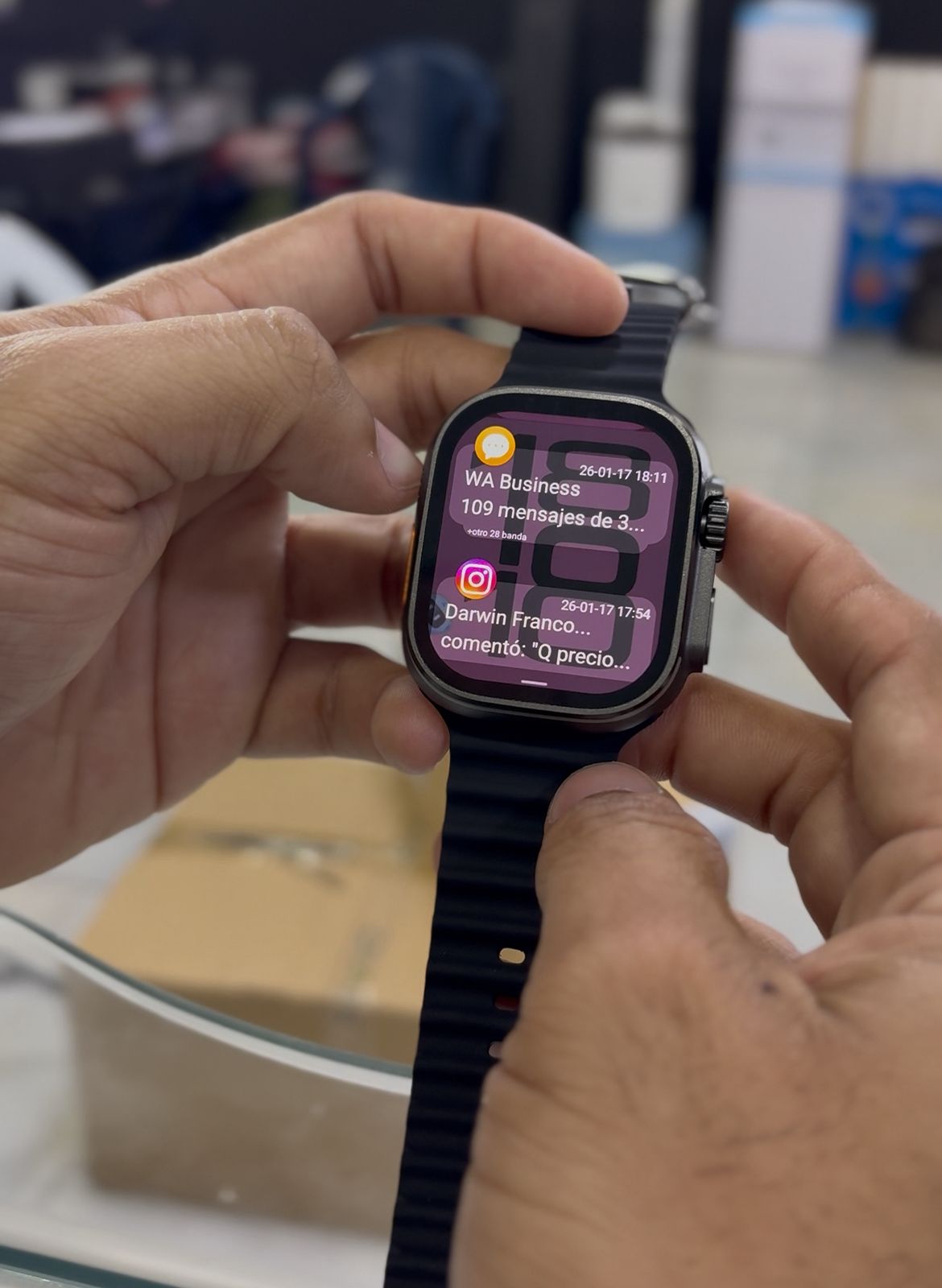Recibe mensajes y notificaciones directamente en el reloj, con un diseño tipo “isla” que te permite leer WhatsApp, Instagram y alertas sin sacar el celular del bolsillo. Ideal para el día a día, el trabajo o cuando estás en movimiento.